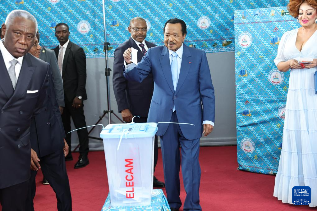 10月12日,在喀麦隆首都雅温得,喀麦隆总统、喀麦隆人民民主联盟候选人保罗·比亚在总统选举中投票。新华社发(科普索 摄)