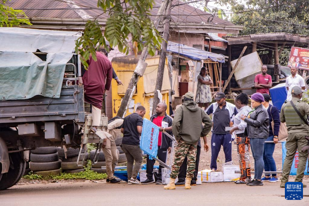 10月12日,在喀麦隆西南大区首府布埃亚,选举工作人员和安保人员在投票站开放前准备投票材料。新华社发(穆朗·廷古姆 摄)