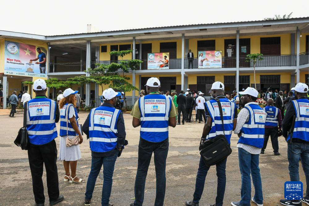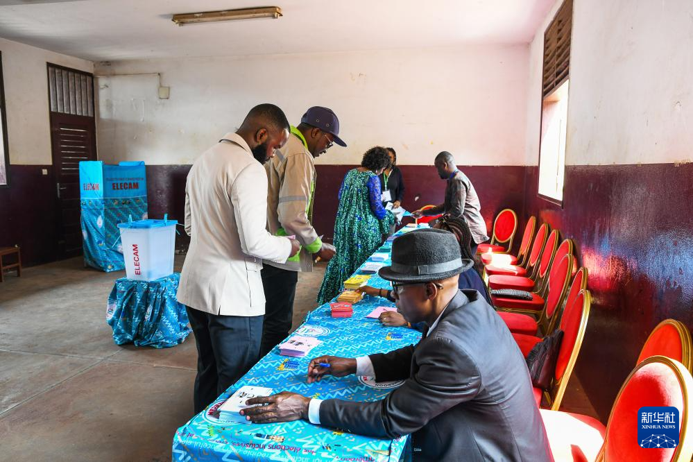 10月12日,在喀麦隆首都雅温得,国内外选举观察员在总统选举期间在投票站监督选举活动。新华社发(科普索 摄)