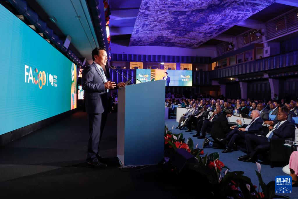 10月13日,在意大利罗马,联合国粮农组织总干事屈冬玉在2025年世界粮食论坛开幕式上讲话。新华社发(联合国粮农组织供图)