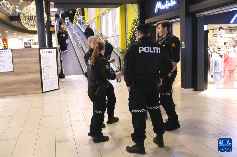 12月8日,在挪威首都奥斯陆的斯托罗购物中心内,警察在巡逻。新华社发(陈雅琴 摄)