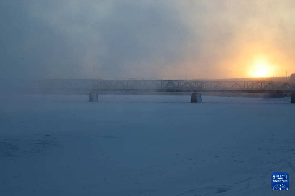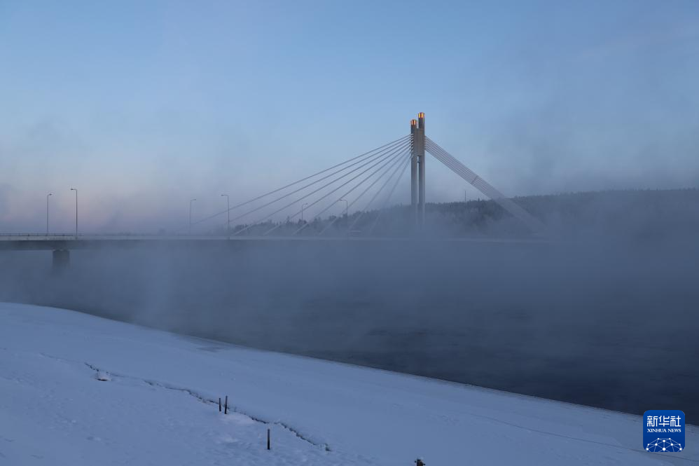 1月3日,在芬兰罗瓦涅米,凯米河上一座大桥掩映在冰雾里。