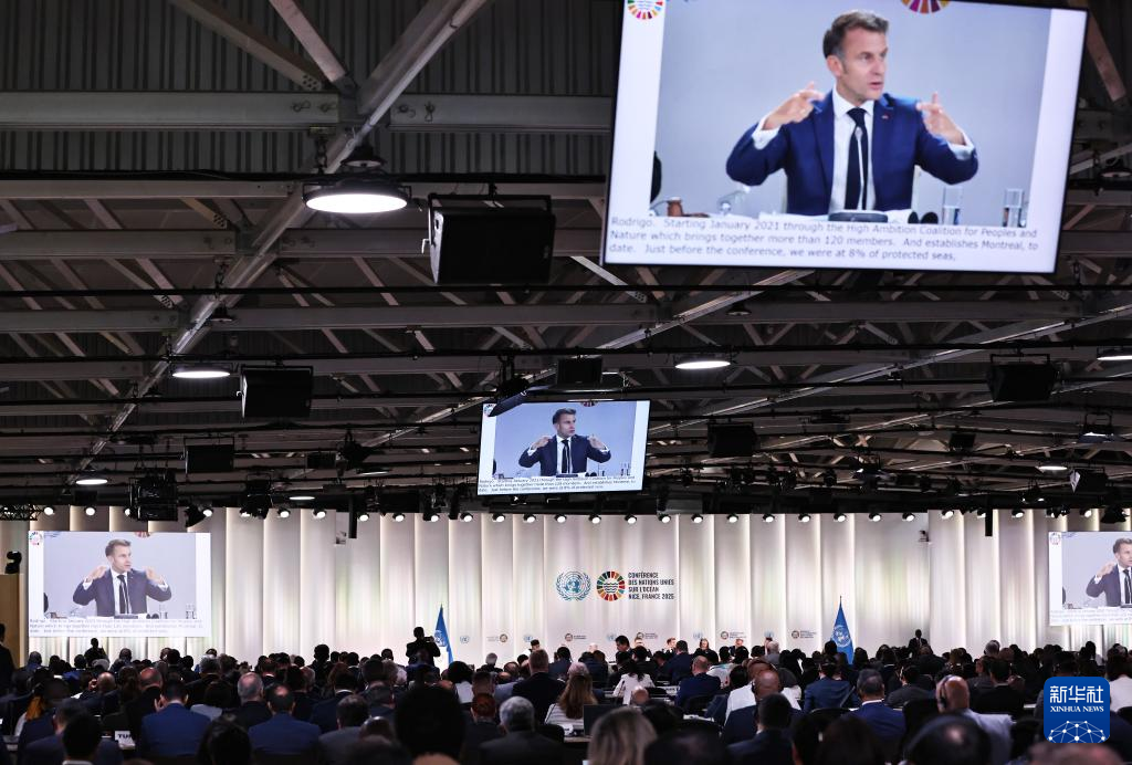 6月9日,在法国尼斯,法国总统马克龙在第三届联合国海洋大会开幕式上致辞。新华社记者 高静 摄