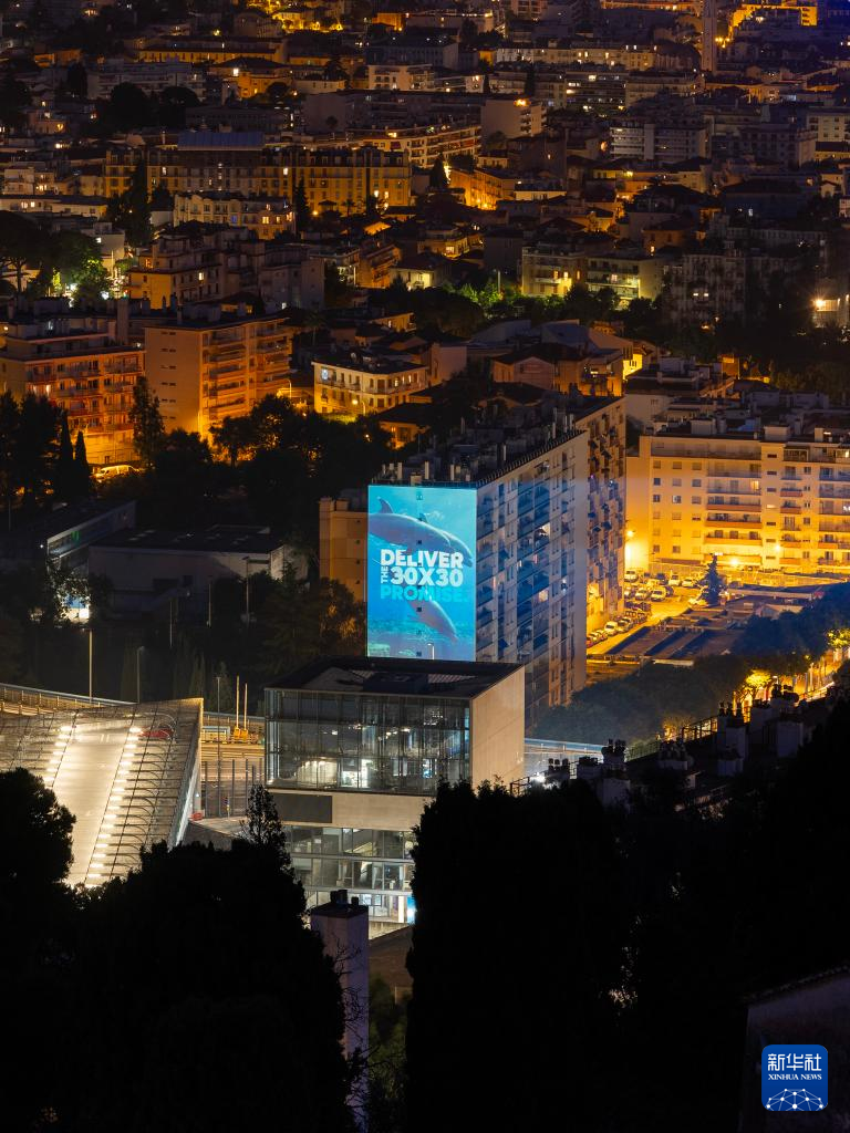 这是6月8日晚在法国尼斯拍摄的第三届联合国海洋大会主题投影。新华社发(第三届联合国海洋大会组委会供图)