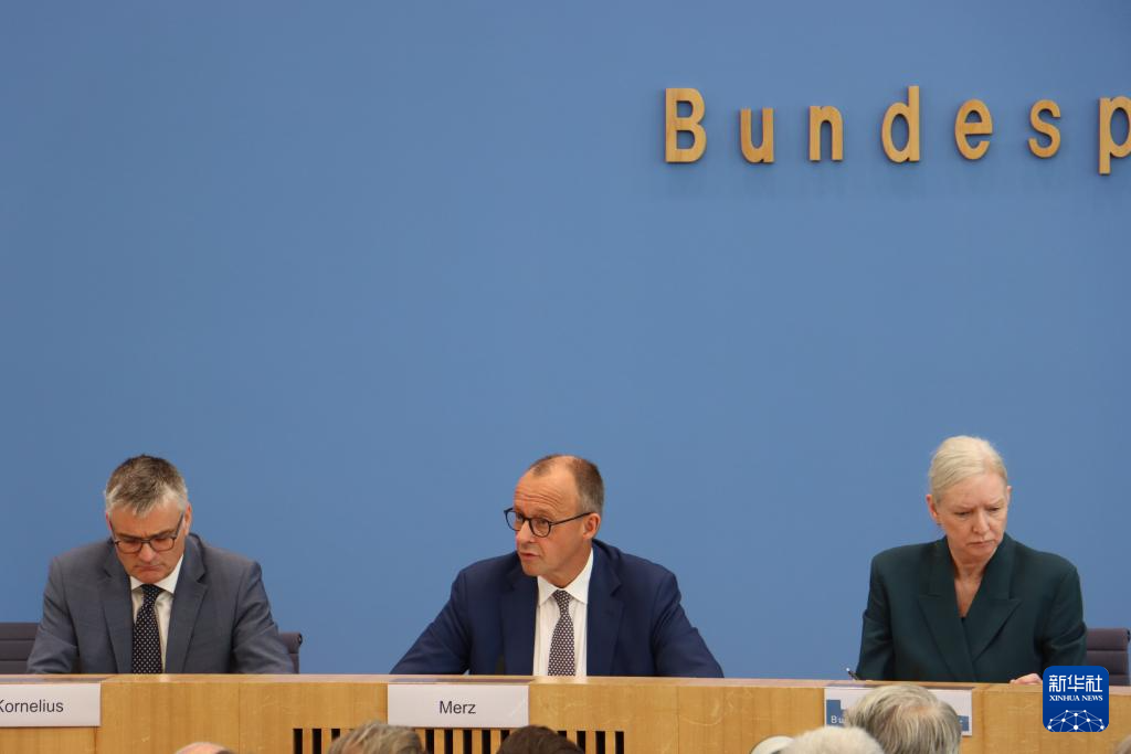 7月18日,德国总理默茨(中)出席在柏林举行的夏季新闻发布会。新华社记者 李函林 摄
