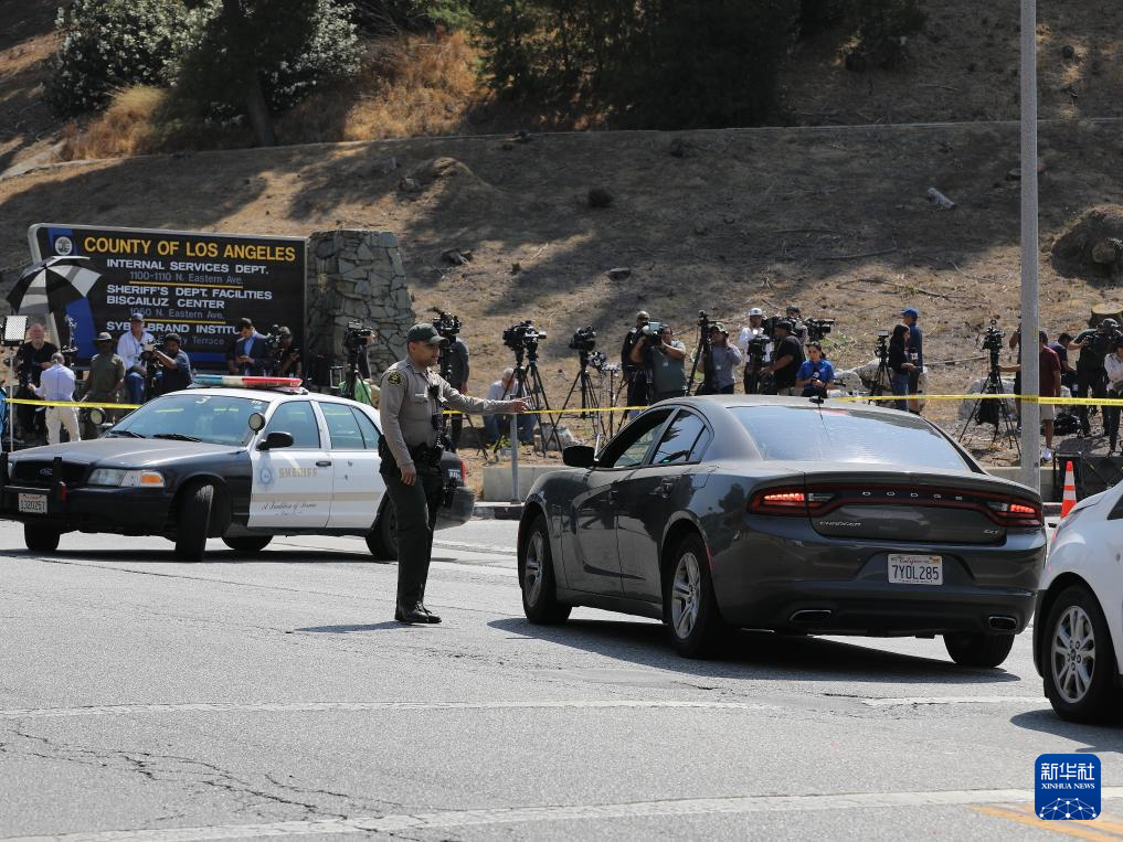 7月18日,警员在美国加利福尼亚州洛杉矶县发生爆炸的警察局训练设施入口处值守。新华社发(曾慧 摄)