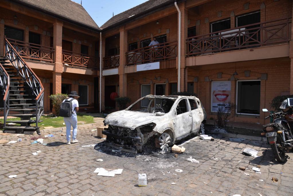 这是9月26日在马达加斯加塔那那利佛商业区拍摄的被损坏的汽车和商铺。新华社发(西塔卡·拉乔纳里松 摄)