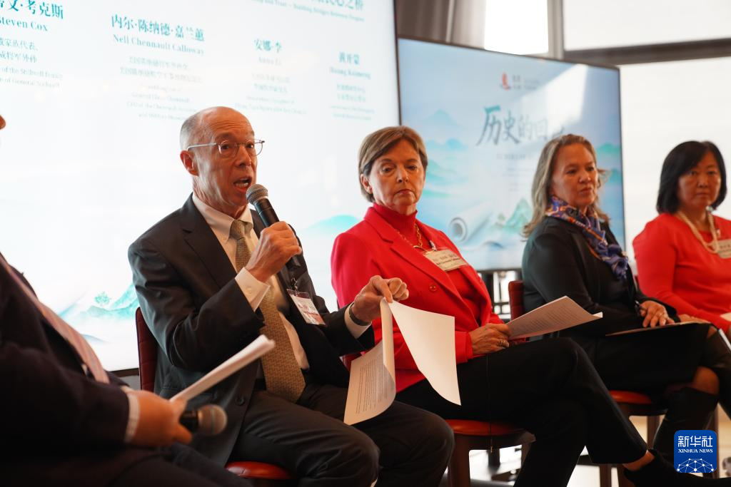 11月25日,在美国纽约举行的2025鼓岭论坛上,史迪威家族代表、史迪威将军外孙特里·史蒂文·考克斯(左一)分享先人与中国人民共同抗战的历史。新华社记者 张凤国 摄