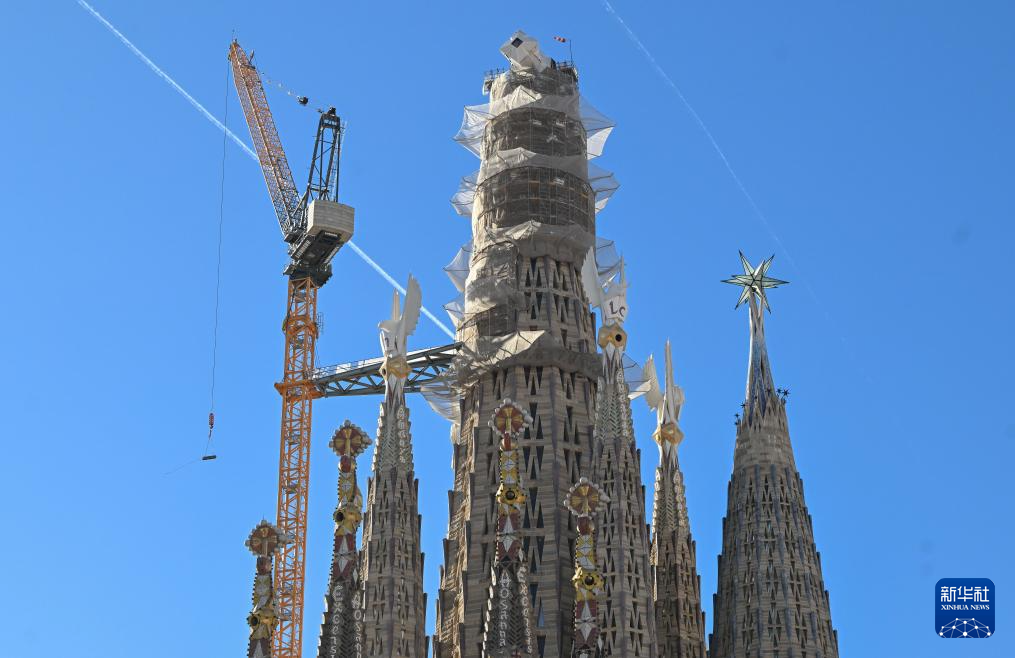 这是12月1日在西班牙巴塞罗那拍摄的施工中的圣家堂中央塔楼中殿顶部。