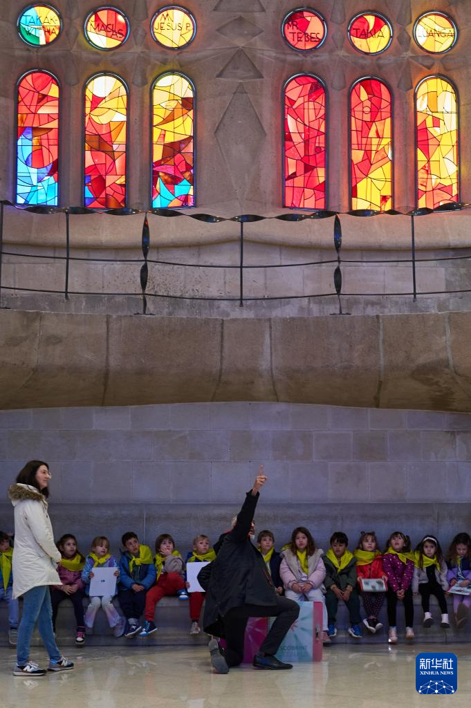 12月1日,一名导游在西班牙巴塞罗那圣家堂为小朋友讲解。
