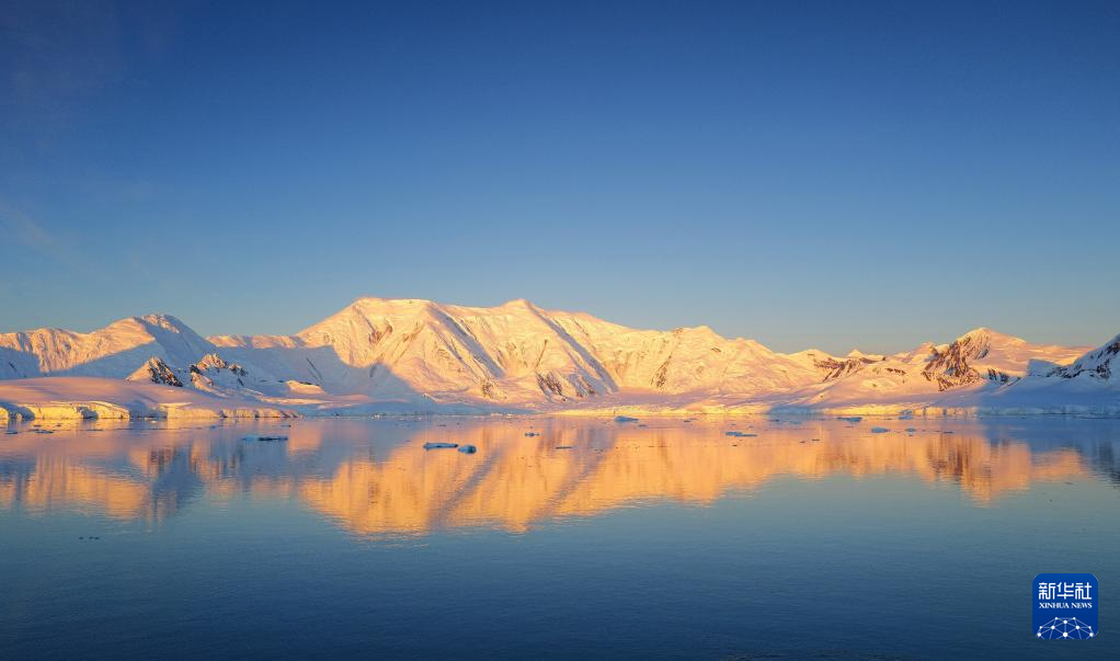 12月14日晚23时10分,南极洲雪山在阳光照耀下呈现金黄色。