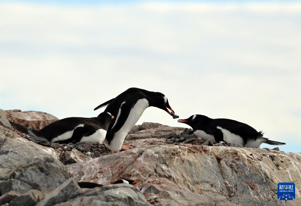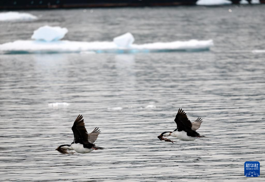 12月13日,在南极洲,两只南极鸬鹚衔来水草筑巢。