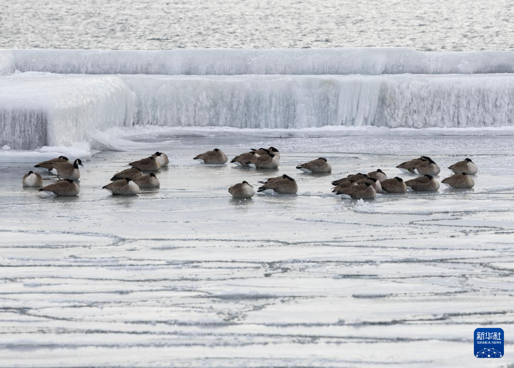 1月24日,在加拿大多伦多,一群加拿大鹅在结冰的安大略湖上休憩。