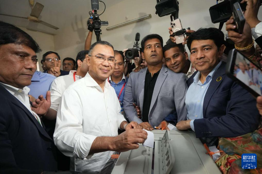 2月12日,在孟加拉国首都达卡一处投票站,孟加拉国民族主义党主席、前总理卡莉达·齐亚之子塔里克·拉赫曼(中)参加投票。新华社发(哈比卜·拉赫曼 摄)