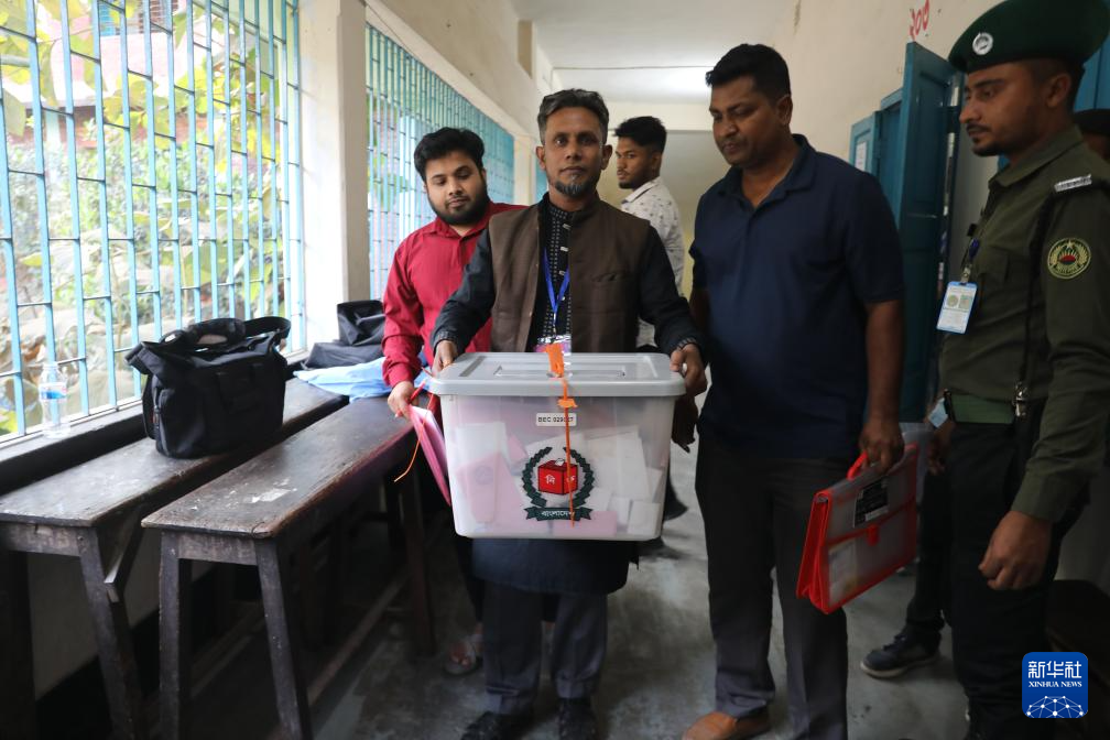 2月12日,在孟加拉国首都达卡,选举工作人员在投票站运送票箱。新华社发(哈比卜·拉赫曼 摄)