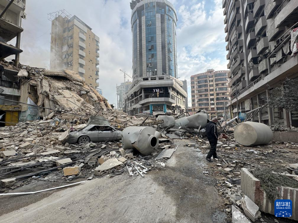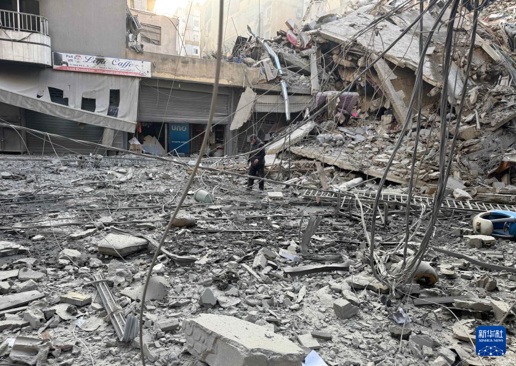 3月7日,在黎巴嫩首都贝鲁特南郊,一名男子行走在被以色列袭击摧毁的建筑废墟中。新华社发(比拉尔·贾维希 摄)