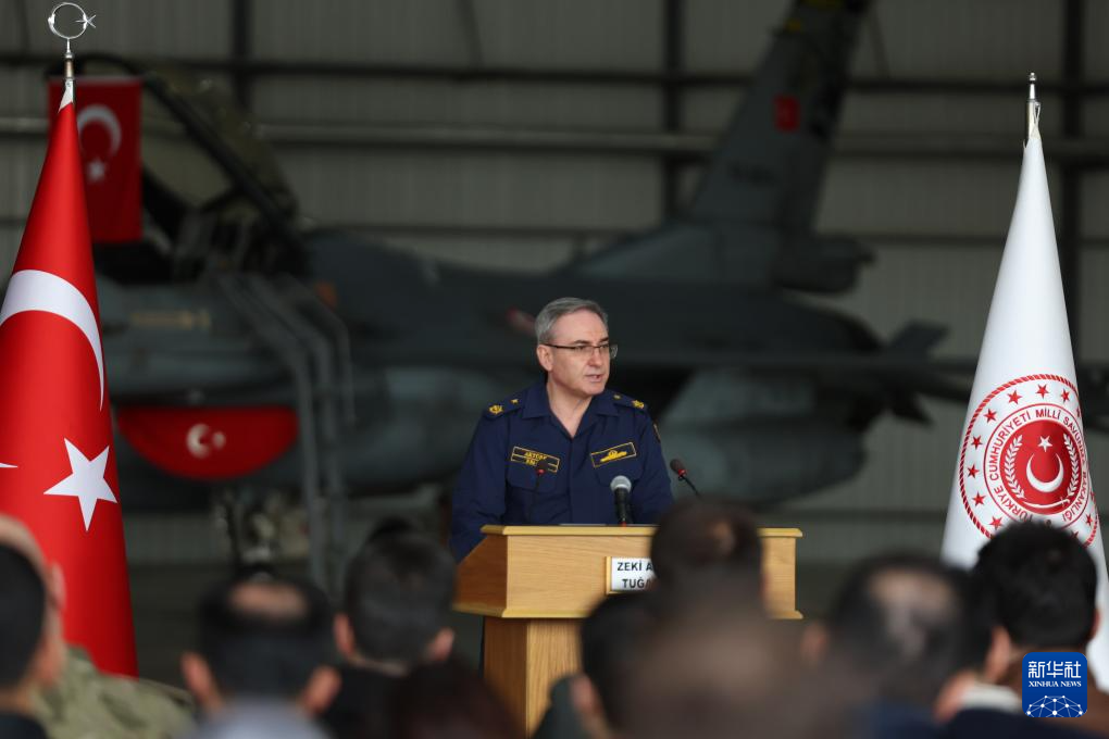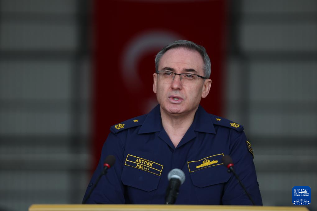 3月18日,土耳其国防部发言人泽基·阿克蒂尔克在位于该国东南部阿达纳省的因吉尔利克空军基地举行的记者会上讲话。新华社发(穆斯塔法·卡亚 摄)