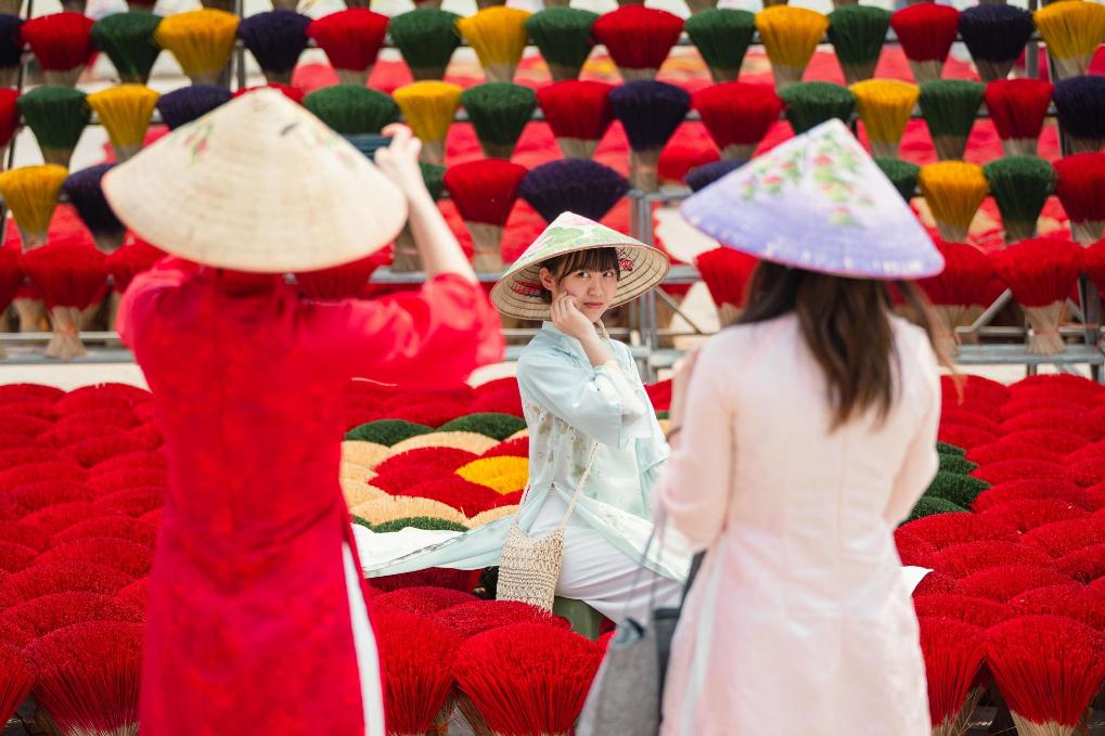 3月24日,在越南广富桥村,游客在晾晒的香签旁拍照。新华社记者 朱炜 摄