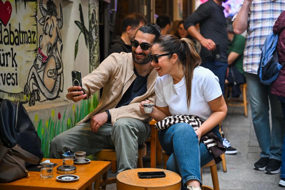 2025年11月22日,顾客在土耳其伊斯坦布尔的曼达巴特马兹咖啡店外合影。新华社记者 刘磊 摄